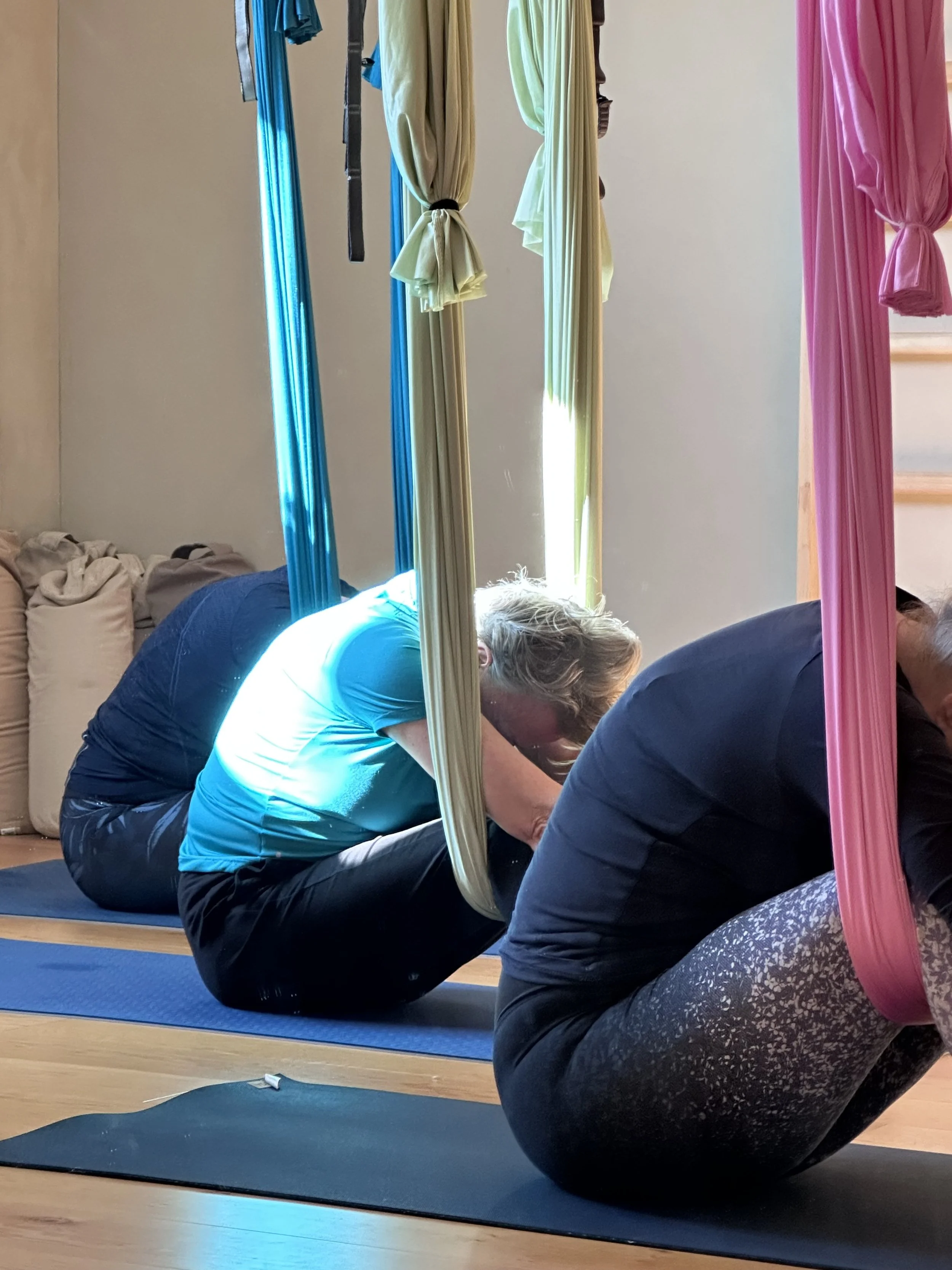Hos mig kan du också sträcka ut kroppen xtra mycket och yoga med avlastning- Aerialyoga, yoga i 6 m tyg.Har du inte testat så gör det. En ny yogaupplevelse .